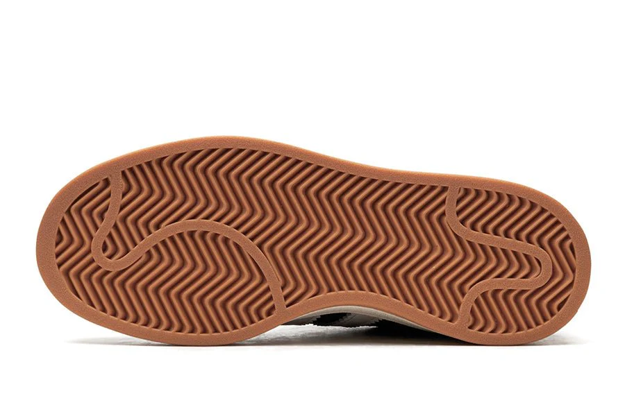 Der Adidas Campus 00s Core Black hat eine schwarze Lederbasis mit den charakteristischen drei breiten weißen Streifen auf dem seitlichen Panel, die für die Marke typisch sind und mit der Fersenlasche harmonieren. Ähnlich wie der Campus 80s zeigt dieses Modell eine vergilbte Sohle, um den Vintage-Effekt zu betonen, und eine Gummisohle. Im Gegensatz zur Erwachsenenversion ist die Sohle bei den GS-Modellen weiß.