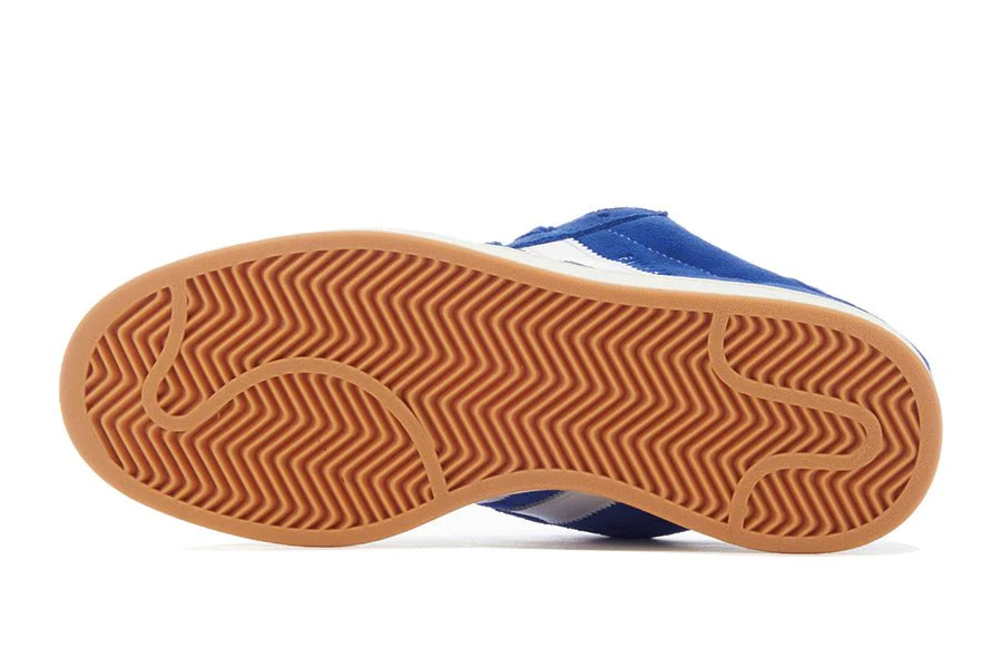 Der Adidas Campus 00s Lucid Blue hat eine Basis aus blauem Leder, begleitet von den bekannten drei weißen Streifen auf den beiden äußeren Seiten, die für die Marke charakteristisch und auf den Heel Tab abgestimmt sind. Die Sohle ist vergilbt, um den Vintage-Effekt zu betonen.