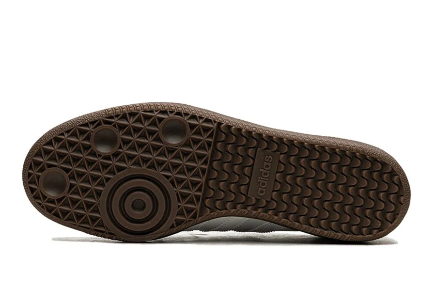 Der adidas Samba Cloud White Blue Gum hat eine Basis aus Weißem Vollnarbenleder mit einem Mudguard aus Wildleder in einer Mischung aus Beige und Grau. Goldene Details wie das "Samba" auf der Seitenwand veredeln das Obermaterial, ebenso wie die drei weißen ikonischen Streifen, die auf den Heeltab abgestimmt sind. Um das Gesamtbild zu vollenden, findet eine Gumsole ihren Platz unter diesem Paar.