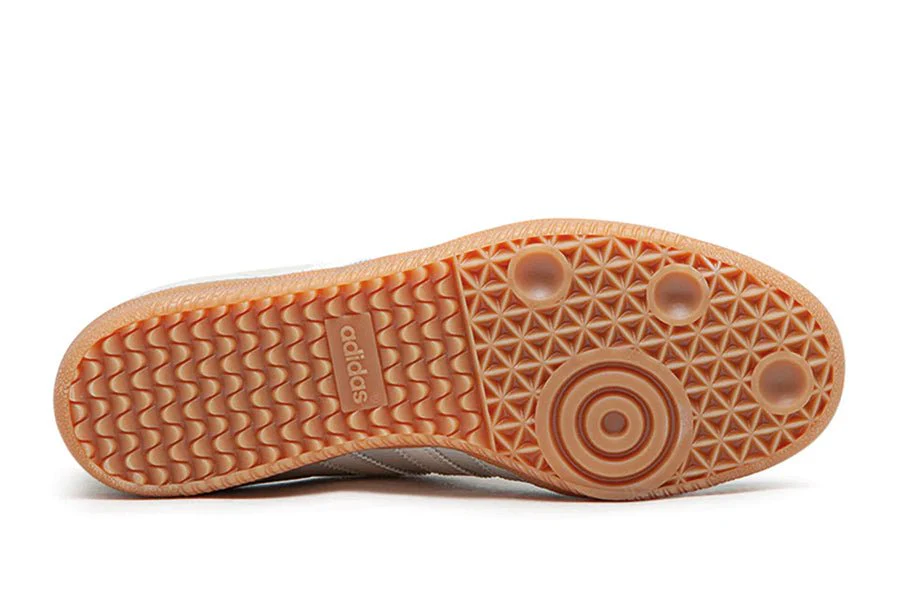 Der Adidas Samba Aluminium Gum präsentiert ein Obermaterial aus beigem genarbtem Leder, ergänzt durch einen tonalen Wildleder-Mudguard. Die ikonischen drei weißen Lederstreifen sind auf dem Seitenpanel gut sichtbar und passen zur Fersenschlaufe. Das goldene "Samba" auf der Seite verleiht dem Obermaterial einen eleganten Touch, während eine Gummisohle das Modell abrundet.