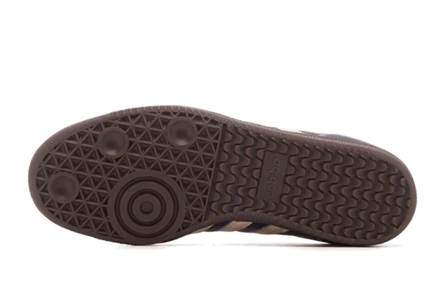 Der Adidas Samba Night Navy Cream White Gum hat ein Obermaterial aus marineblauem Vollnarbenleder mit tonalem Wildleder am Vorderfuß. Das goldene "Samba" auf den Seiten, das zum Branding auf der Zunge passt, verleiht dem Obermaterial einen besonderen Glanz. Drei Streifen aus cremefarbenem Leder stehen in Kontrast zu dem restlichen Teilen des Schuhs.