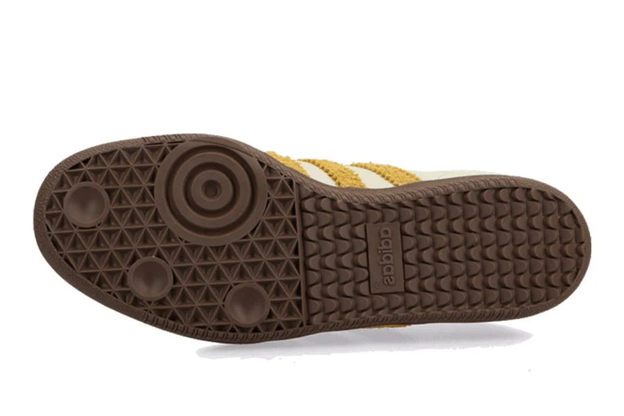 Der adidas Samba OG Off-White Oat hat eine Basis aus off-weißem Vollnarbenleder mit einem Mudguard aus Wildleder in Braun. Goldene Details wie das "Samba" auf der Seitenwand veredeln das Obermaterial, ebenso wie die drei gelben ikonischen Streifen. Um das Gesamtbild zu vollenden, findet eine Gumsole ihren Platz unter diesem Paar.