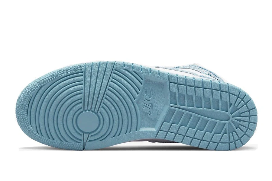 der air jordan 1 high denim hat eine basis aus weißem leder, die von overlays aus verwaschenem denim begleitet wird. ungeschliffene kanten sorgen für textur und verleihen dieser ausgearbeiteten silhouette authentizität. die krönung des ganzen sind die imposanten goldenen metallspangen, auf denen ein jumpman und der schriftzug "jordan" zu sehen sind.