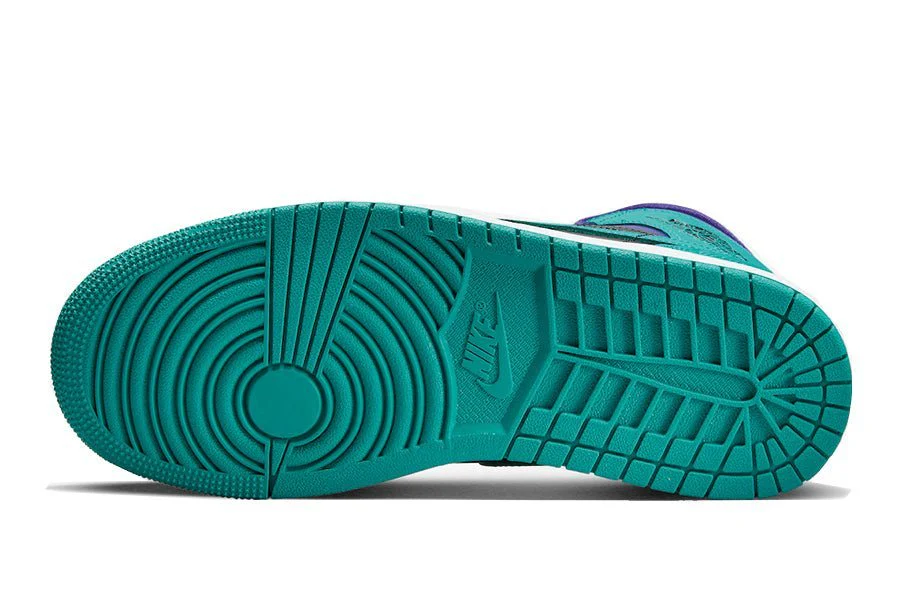 der air jordan 1 mid black grape hat ein dreifarbiges obermaterial. es gibt ein schwarzes seitenpanel, das mit dem futter und der zunge übereinstimmt, und einen türkisfarbenen swoosh, der mit den laschen, der fersenverstärkung, der toebox und der outsole übereinstimmt. der rest des obermaterials besteht aus violetten ledereinsätzen.