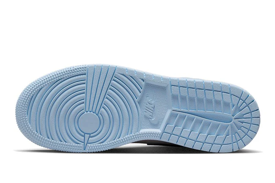 Der Air Jordan 1 Mid Ice Blue hat ein Obermaterial aus off-white Leder, das mit dem Wings-Logo auf dem Überschlag harmoniert. Dann gibt es noch Leder-Overlays in einer hellblauen Farbe. Der Swoosh an der Seite, die Toebox und der Kragen sind aus schwarzem Leder gefertigt und sorgen für den letzten Feinschliff.