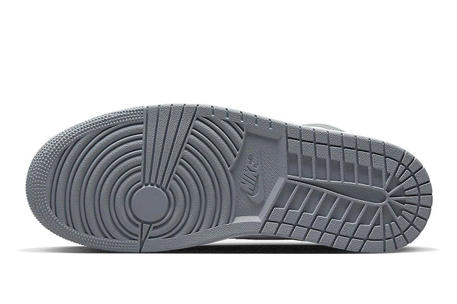 der air jordan 1 high stealth bietet ein obermaterial, das aus einer mischung aus verschiedenen lederarten besteht. die basis besteht aus weißem craquelé-leder, das auf die grauen laschen abgestimmt ist, während für die toebox und die fersenverstärkung genarbtes leder verwendet wird. ein paar details aus weißem glattleder sind ebenfalls zu sehen, vor allem im bereich der ösen. eine tonige sohle vervollständigt das gesamtbild.