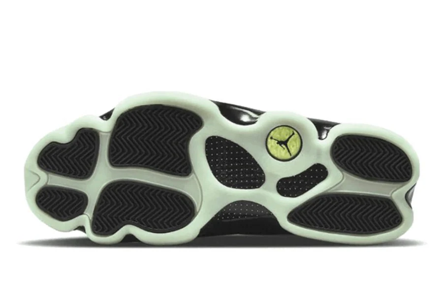 der air jordan 13 low singles' day hat eine basis aus schwarzem, genarbtem leder mit hellgrüner steppung, die ein geometrisches gittermuster zeigt. dieses ist mit glow in the dark-schriftzügen im binären look versehen, die mit der schwarzen und phosphoreszierenden grünen sohle zusammenpassen. eine einlegesohle mit mustern, die an computerchips erinnern, vervollständigt das design von tinker hatfield.
