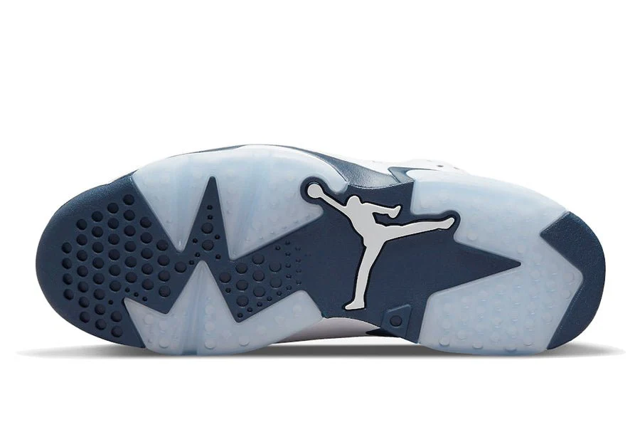Der Air Jordan 6 Midnight Navy hat ein Obermaterial aus weißem perforiertem Leder, das von weißen Ledereinsätzen begleitet wird. Die Midsole, die hintere Fersenverstärkung und die Zunge sind mit Navy-Akzenten versehen.