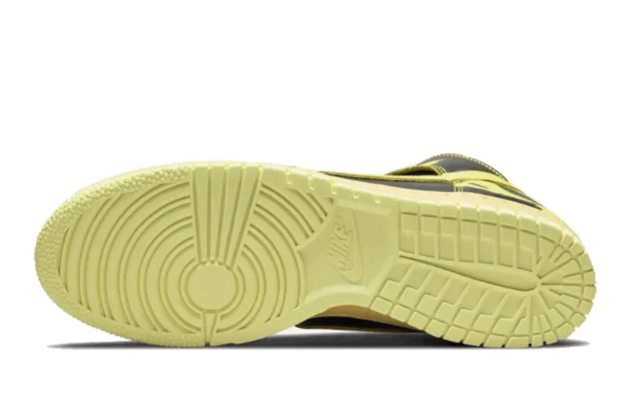 der nike dunk high 1985 acid wash yellow hat ein obermaterial aus schwarzem premium-leder mit gelben flecken und verwaschenen overlays. ein gelber swoosh betont die panels der silhouette und passt perfekt zur outsole. eine vintage-sohle mit antik-effekt vervollständigt das design von peter moore.