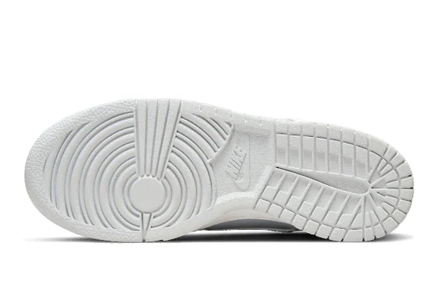 der nike dunk high summit white football grey hat eine basis aus grauem leder mit blauen schattierungen. das mudguard, die ösen und der seitliche swoosh sind mit weißem leder überzogen. eine zunge mit weißen schnürsenkeln veredelt das von peter moore entworfene design.