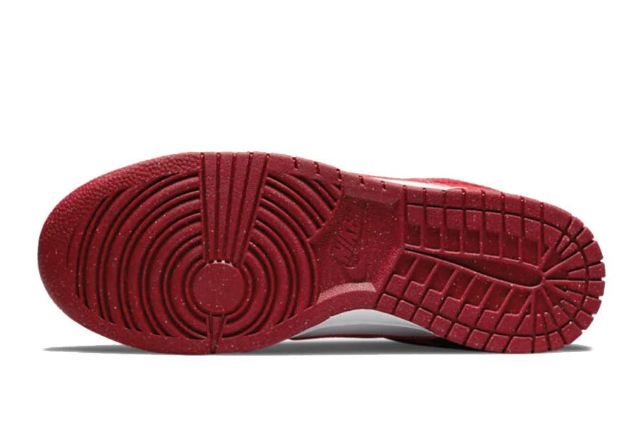 Der Nike Dunk Low Next Nature Gym Red hat eine Basis aus weißem, recyceltem Leder mit leuchtend roten Einsätzen an den Ösen, dem Mudguard und der Ferse. Das bekannte zweifarbige Muster des Dunk Low findet sich auch in den Branding-Elementen und der Sohle wieder.