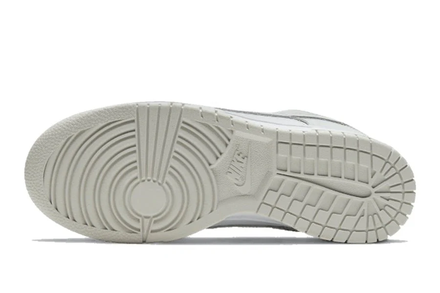 der nike dunk low photon dust hat ein obermaterial aus weißem leder mit grauen ledereinsätzen. die beiden farben gehen nahtlos ineinander über und sorgen für einen dezenten look. das nike-branding befindet sich auf der zunge und an der ferse.