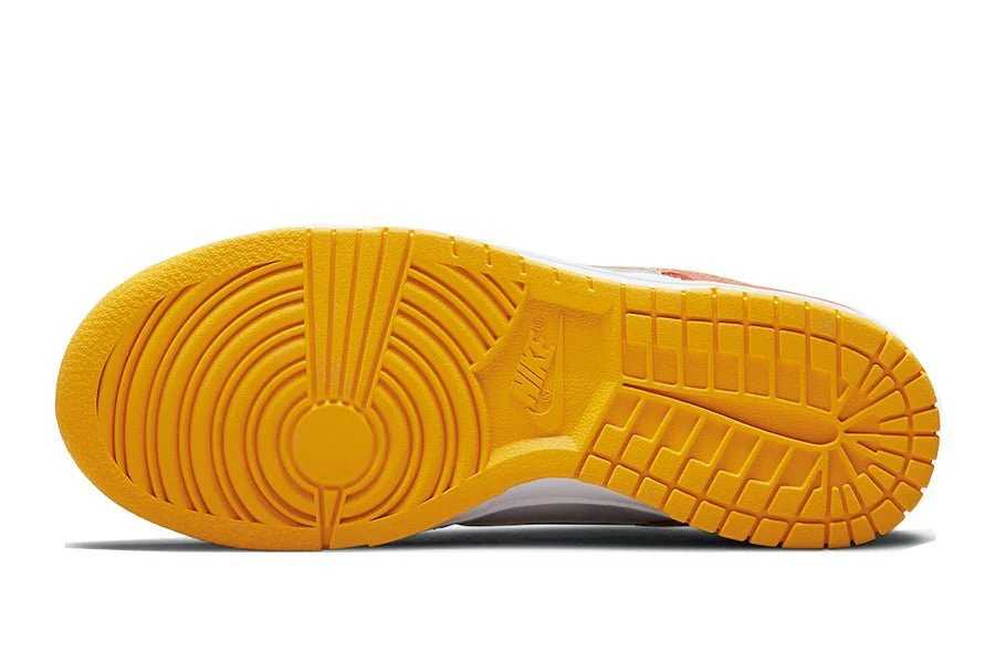der nike dunk low university gold hat eine klassische basis aus weißem leder, wohingegen die overlays in einem gelungenen blutorange erstrahlen. die schnürsenkel, das branding auf der zunge und die einlegesohle sind ebenfalls in orange gehalten. für den swoosh wurde ein goldenes leder gewählt. dieser farbton passt auch zur outsole.