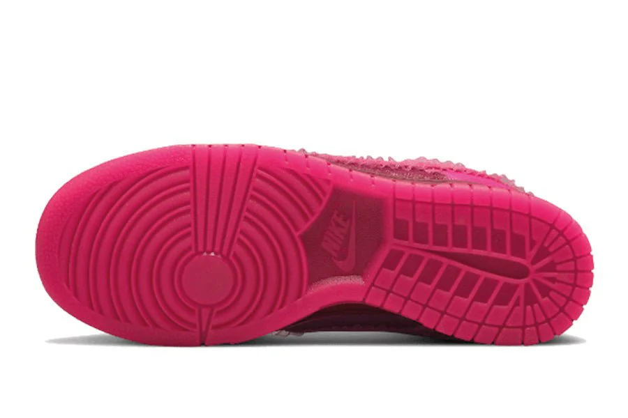 der nike dunk low valentines day (2022) hat ein obermaterial aus rosafarbenem leder und bordeauxroten twill an der zunge, den panels und der toebox. der swoosh besteht aus rosa wildleder mit spitzenrändern, die von den verpackungen der schokoladenschachteln inspiriert sind, die am tag der liebenden verschenkt werden. die gesamte silhouette ruht auf einer bordeauxroten zwischensohle mit durchscheinender rosafarbener outsole.