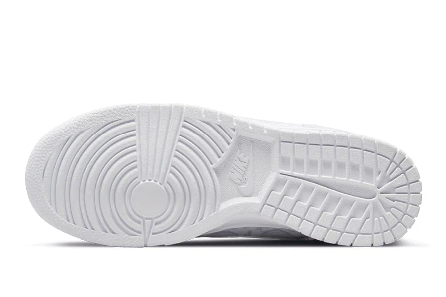 der nike dunk low white paisley hat eine weiße canvas-struktur, die durch ein hellgraues paisley-muster ergänzt wird, das sich über die gesamte silhouette erstreckt. der seitliche swoosh und der heel tab an der ferse sind aus weißem leder. die klassische weiße sohle hat eine weiße outsole, die sich der restlichen silhouette anpasst und den auffälligen look vervollständigt.